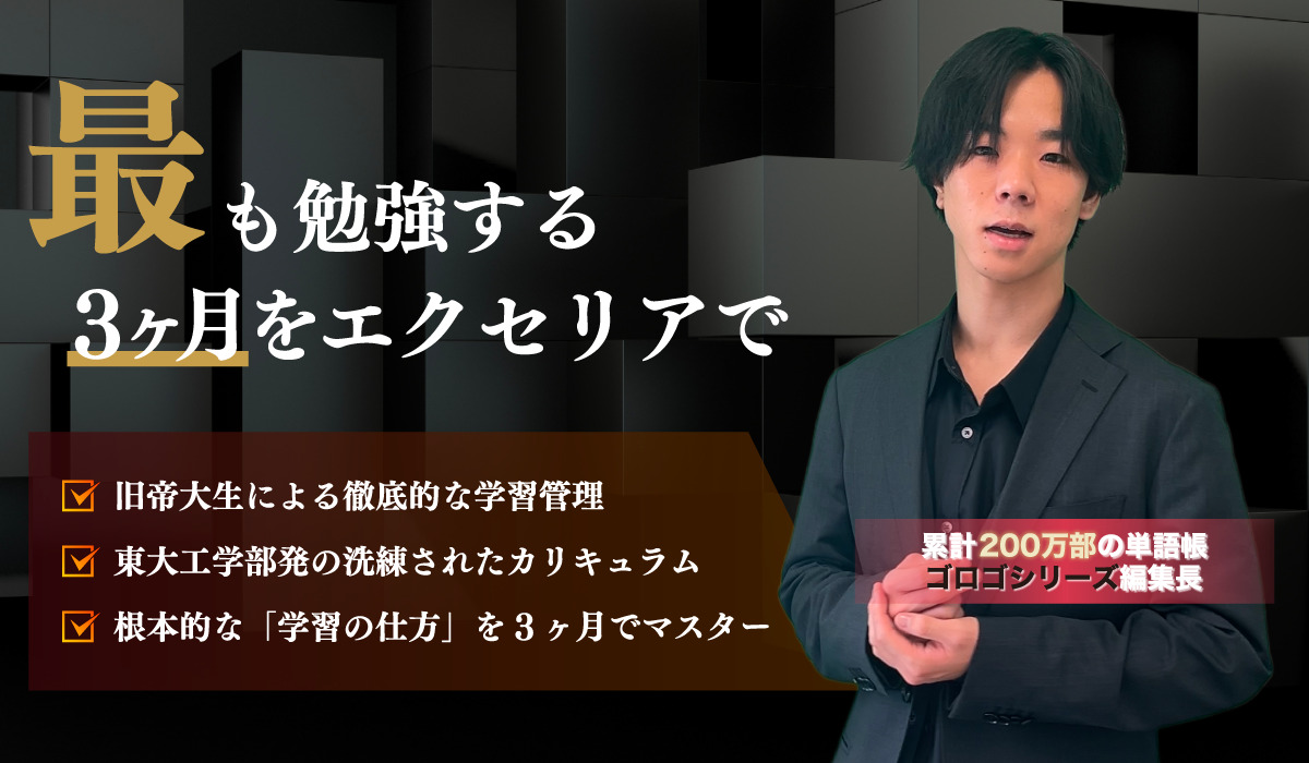 私は、地元の公立小中学校から、日比谷高校を経て東京大学へ進学いたしました。特段勉強ができる家系の生まれでもありませんし、海外経験があったわけでもありません。そんな私が東大に合格出来たのは、受験をハックしたからです。普通の高校生が、最短で旧帝大レベルに到達するためのルートの原型が、私の実体験にあります。エクセリアは、私が経験してきた再現性が極めて高いこのルートを、高い志を持つ生徒の皆さんにご提供します。
